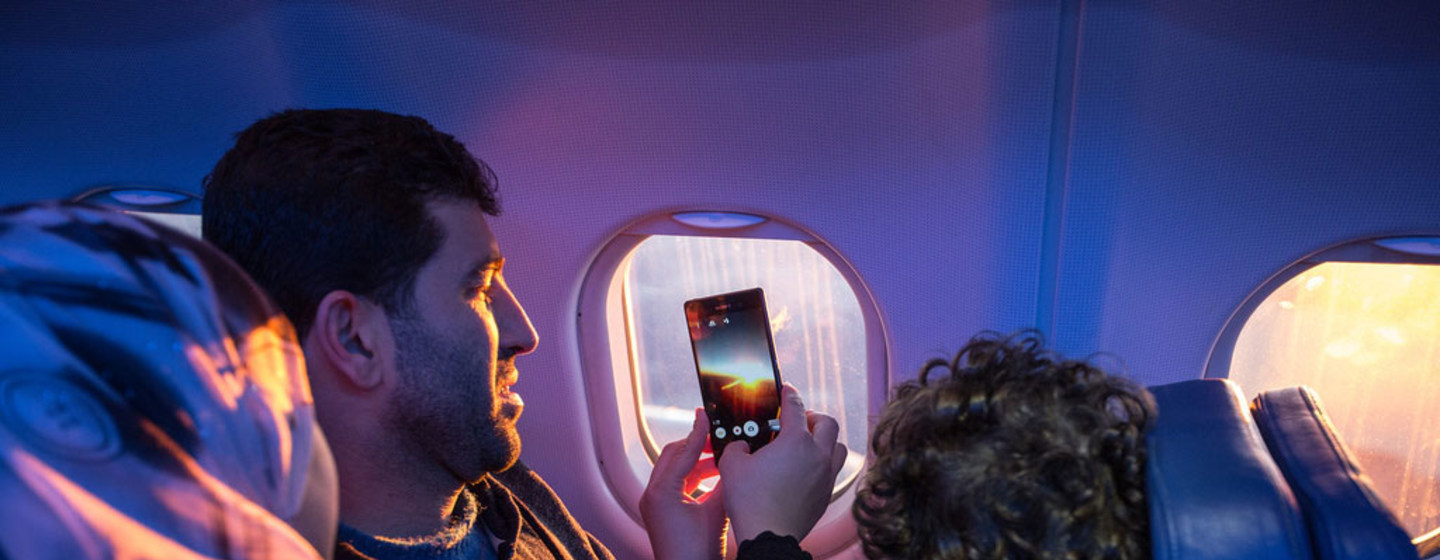 | Una familia mira por la ventana del avión y toma fotos mientras viajan a su nuevo hogar. OIM/Muse Mohammed |